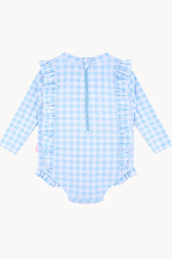 Seafolly Girls Gingham Frill Sunsuit in Blue features a round neckline, back zipper, long sleeves, UPF 50+ sun protection rating, and is fully lined.