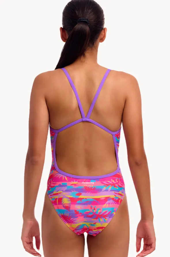 Funkita Girls Leave In Single Strap One Piece in Pink/Purple offers single bind straps, quick drying, chlorine resistant thread, available in sizes 8-14.
