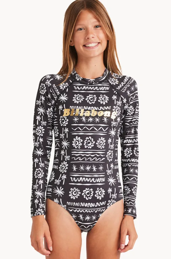 Billabong Girls Lost On You Long Sleeve Sunsuit in Black offers long sleeves, sun protection rating, back zipper, sustainable, and is available in sizes 10-14.