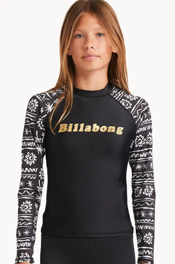 Billabong Girls Lost On You Long Sleeve Suntop in Black features long sleeves, sun protection rating, classic fit, sustainable, and is available in sizes 10-16.