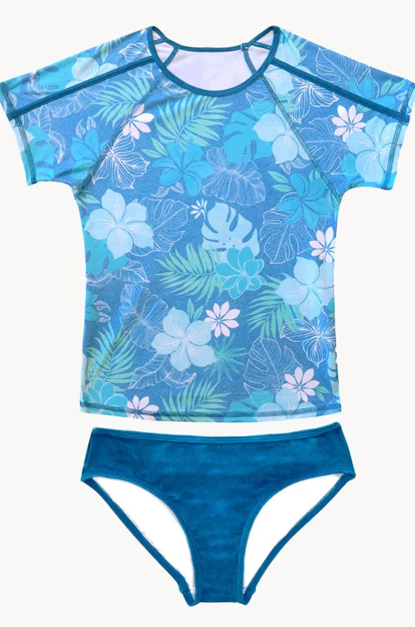 Salty Ink Girls Tropicana Suntop Set in Blue features a round neckline, short sleeves, sun protection rating, hipster pant, and is available in sizes 8-16.