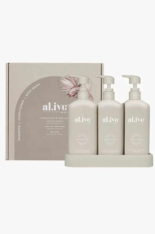 Al.ive Body Hydrate Hair & Body Trio includes shampoo, conditioner, and body wash. Super hydrating and nourishing for hair and skin.