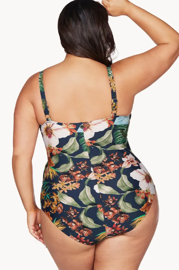 Artesands Into The Saltu Hayes D/DD Cup One Piece in Navy offers underwire, shelf bra, removable cups, powermesh, sustainable, is best suited to D-DD cup sizes.