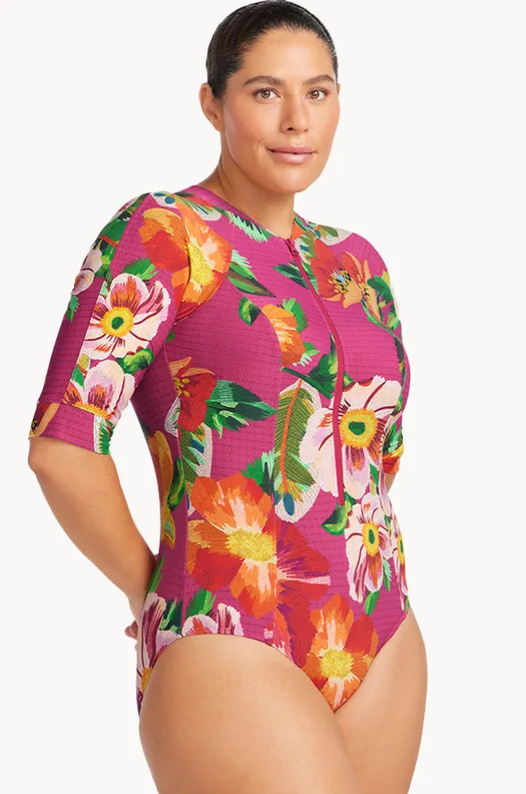 Artesands Le Recife Seurat Sunsuit in Pink features a high neckline, shelf bra, soft cups, 3/4 length sleeves, UPF protection, designed for sizes 10-24.
