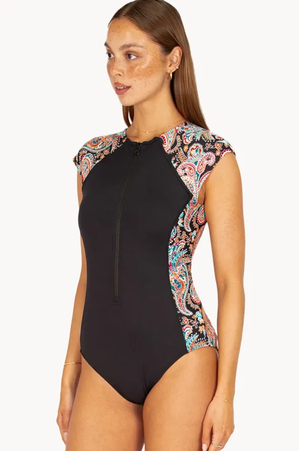 Baku Marrakesh Sunsuit in Black features a round neckline, UPF 50+ sun protection, front zipper, soft cups, shelf bra, and is best suited to A-DD cup sizes.