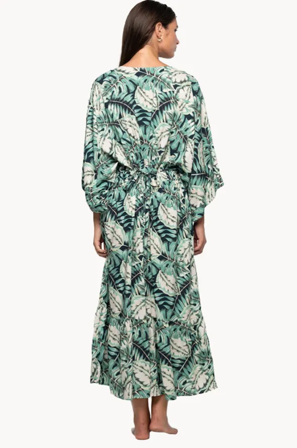 Nip Tuck Martinique Corrimal Maxi Dress in Blue Slate offers long kimono style sleeves, lace up front, adjustable waist with back tie, and is available in O/S.