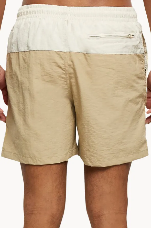 Urban Classics Mens Block Swim Short in Beige features a 5″ inseam, quick-dry nylon, mesh lining, drawstring waist & side pockets.