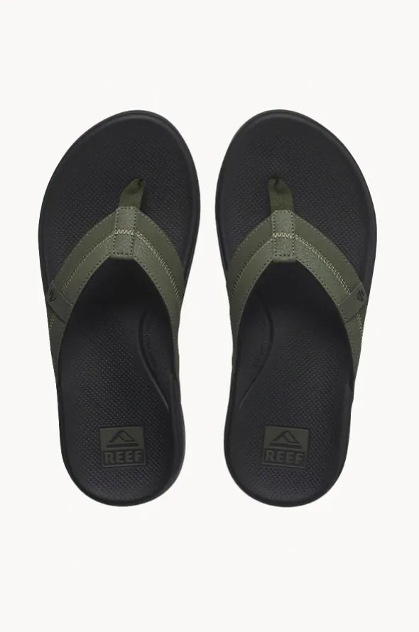 Reef Mens Cushion Phantom 2.0 Thong in Olive offers a comfortable synthetic strap, arch support, moulded rubber outsole, available in sizes 8-13.