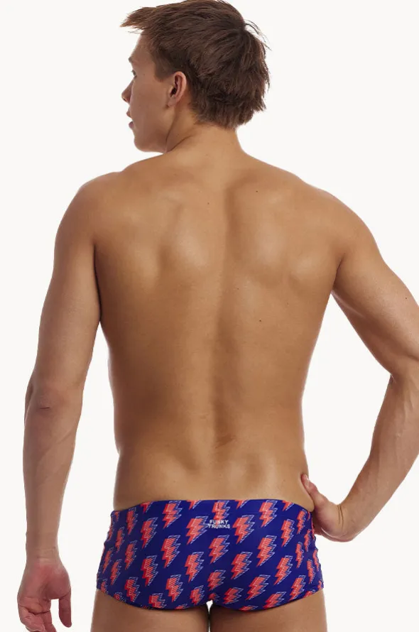 Funky Trunks Mens Flash Trunk in Navy/Red features 14cm sides, elasticated waistband, drawcord, quick drying, sustainable and chlorine resistant.