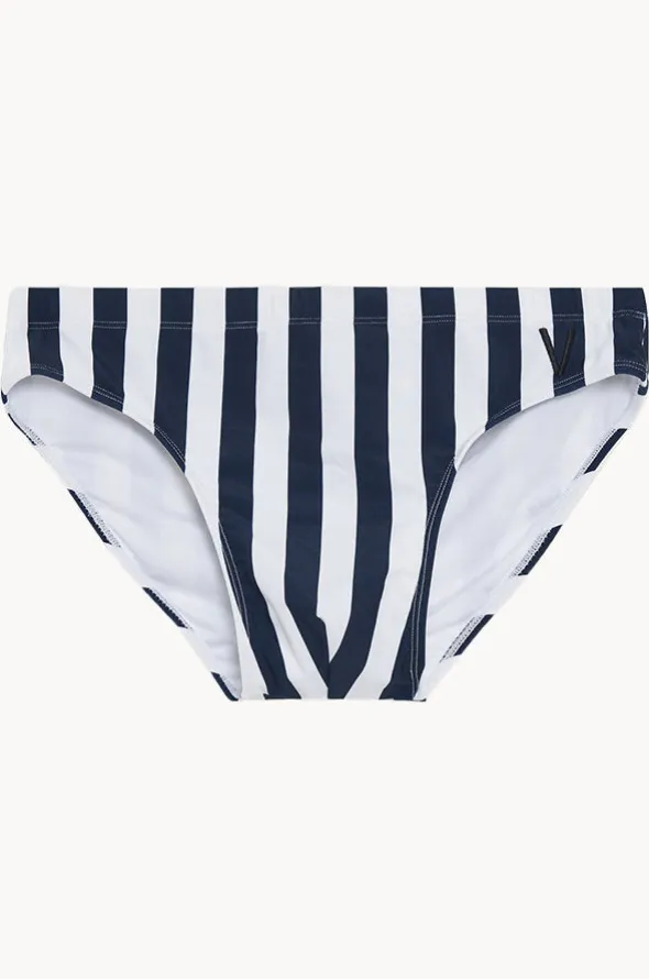Vacay Mens Oslo Brief in Navy/White features an elasticated waistband, drawcord, embroidered logo, quick drying fabric, and is available in sizes S-XL.