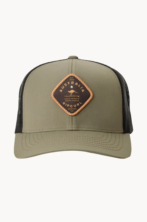 Rip Curl Mens Road Trippin Trucker Cap in Olive features a curved peak, mesh panels, front woven badge, adjustable back, sustainable, and is available in O/S.