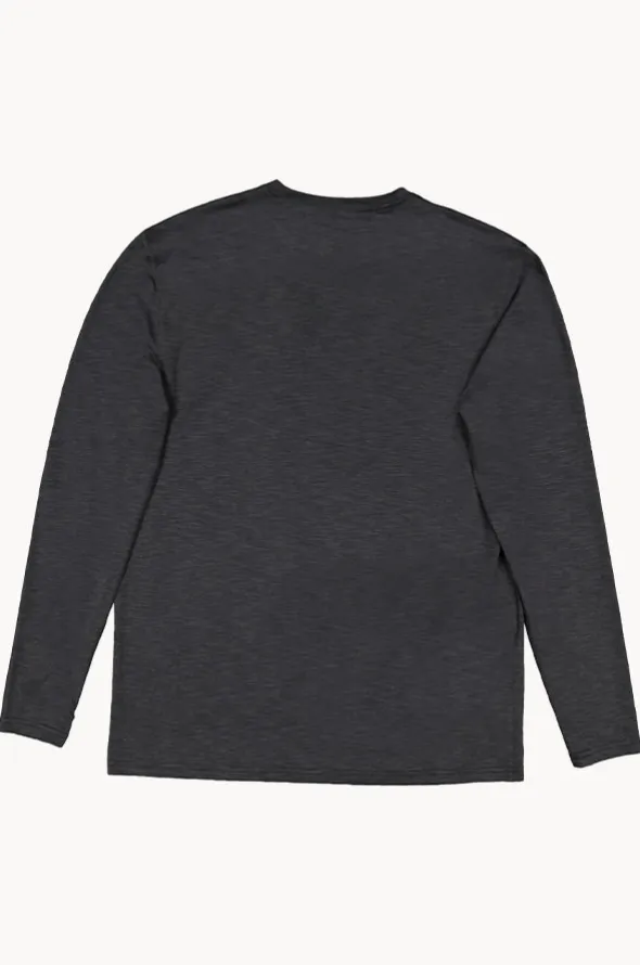 Billabong Mens Shoreline Long Sleeve Suntop in Black features a round neckline, long sleeves, UPF 50+ sun protection rating, and has a loose fit.