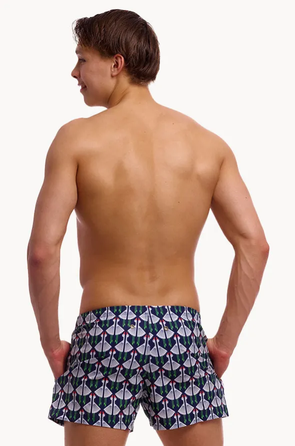 Funky Trunks Mens Sitting Duck Shorty Short in Navy/White features an elasticated waistband, drawcord, deep side pockets, 8.5cm inseam, and is quick drying.