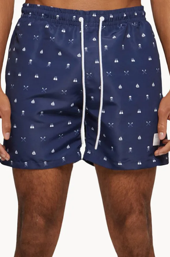 Urban Classics Mens Skull and Yacht Swim Short in Navy features a 5″ inseam, quick-dry nylon, mesh lining, drawstring waist & side pockets.