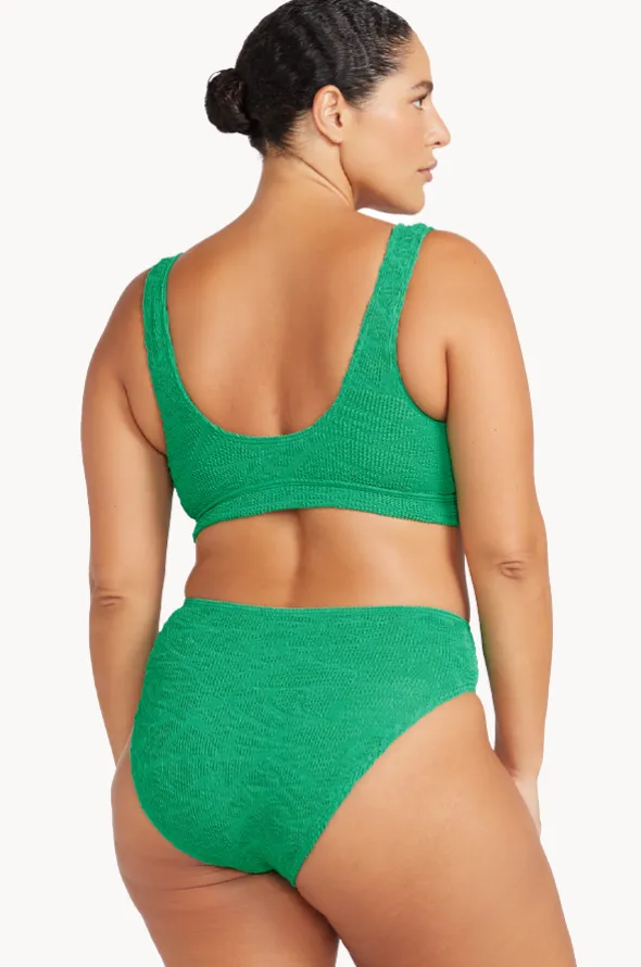 The O’Keefe V Crop Set in Green features a V-shaped crop top, matching high waisted pant, and is best suited to B-DD cup sizes, available in one size fits all.