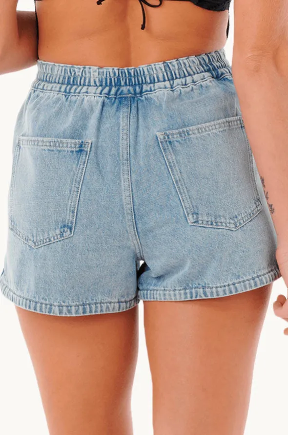 Rip Curl Pacific Rider Denim Short in Vintage Blue features a high rise waist, button and zip closure, front and back pockets, and is available in sizes XS-XL.