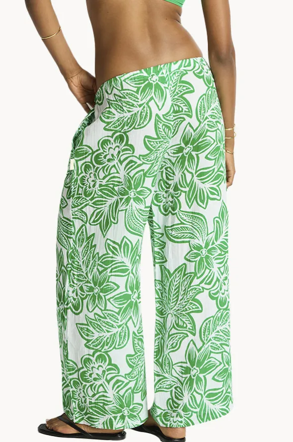 Sea Level Palmera Resort Surf Pant in Green offers an elasticated waistband, drawcord, relaxed leg, side pockets, full length, and is available in sizes XS-Xl.