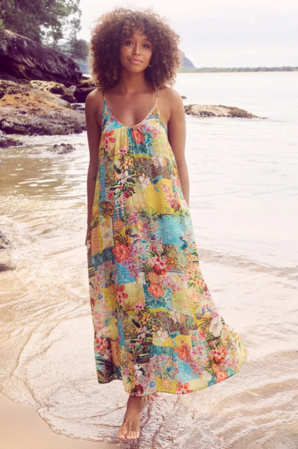 Sunseeker Papaya Scoop Maxi Dress in Multi features a scoop neckline, adjustable thin straps, inseam side pockets, maxi length, and is available in sizes XS-L.
