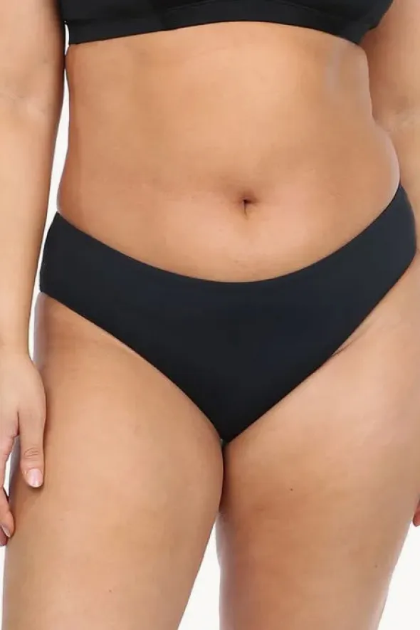 The Base Swim Plain Mid Pant in Black features a mid-rise waist, moderate coverage, internal powermeshing for tummy control, and designed in sizes 8-18.