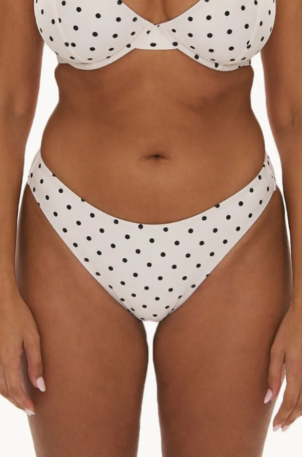 Raq Polka Dot 90’s Brief in Cream features a raised legline, low-medium coverage, polka dot print, sustainable thread, and is available in sizes 8-14.