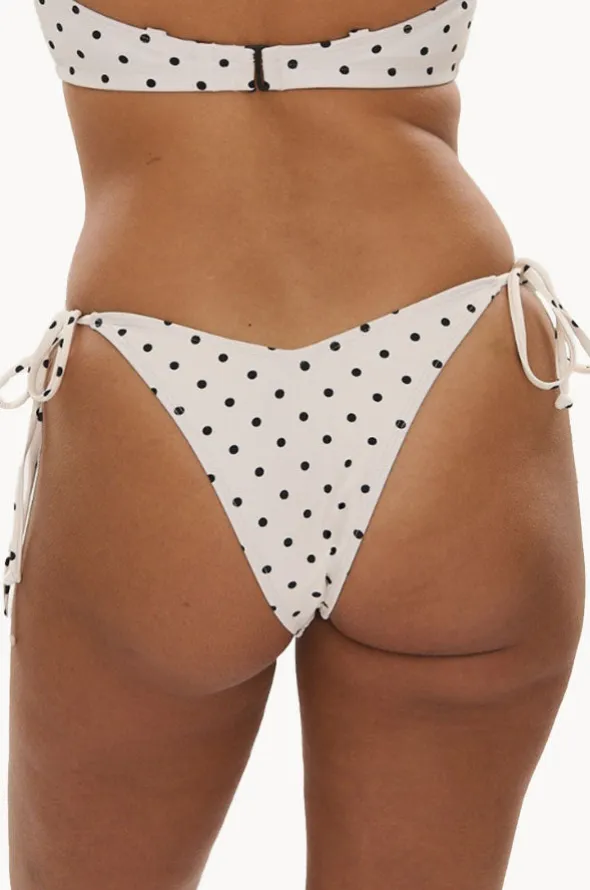 RAQ Polka Dot Cheeky Tie Side Pant in Cream features a high cut legline, adjustable tie sides, cheeky coverage, shimmer stripe, is available in sizes 8-12.