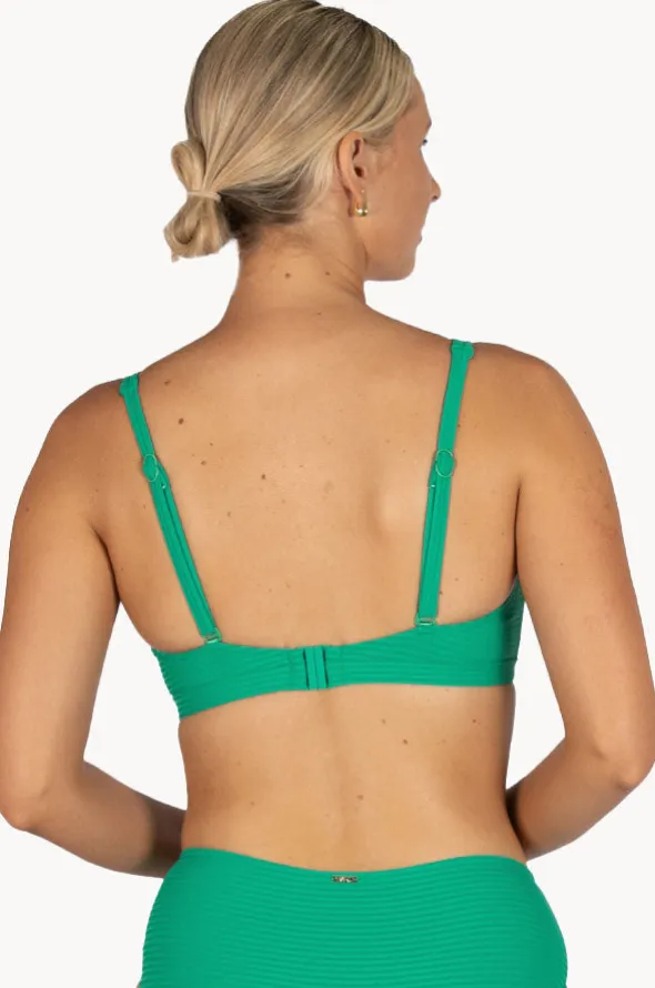 Baku Positano D/E Cup Underwire Bra in Emerald features a U-bar front detail, underwire, removable cups, side boning, and is best suited to D-E cup sizes.