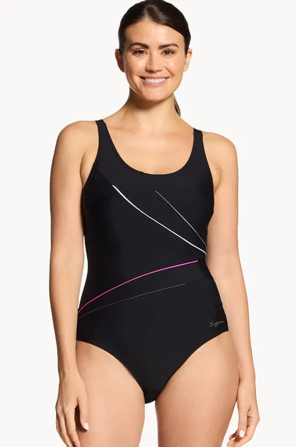 Zoggs Safari Leaf Macmaster Adjustbale Scoopback One Piece in Black/Multi offers piping detail, chlorine resistant, powermesh, is best suited to B-E cup sizes.