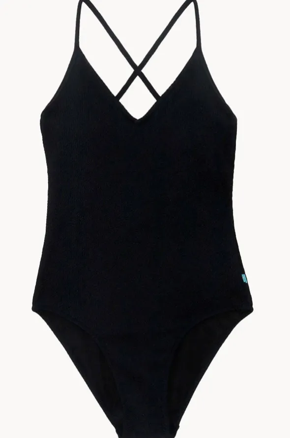Salty Ink Salty Rib One Piece in Black features a V-shaped neckline, adjustable tie back, medium coverage, ribbed fabric, and is best suited to A-C cup sizes.