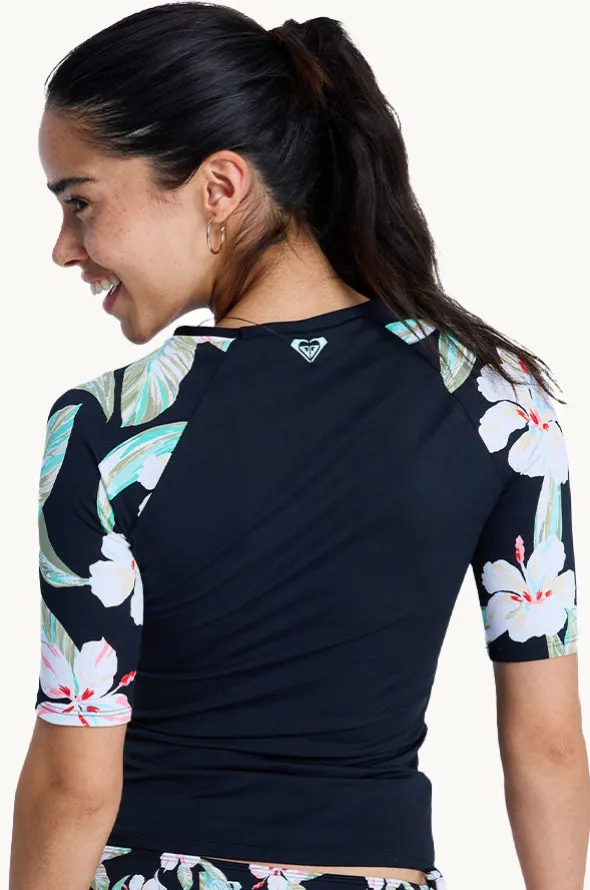 Roxy Spring Charming Short Sleeve Suntop in Black features a round neckline, short sleeves, UPF 50+ sun protection rating, and is available in sizes S-2XL.