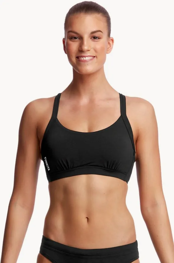 The Funkita Still Black Hold Steady Crop Top in Black, features a supportive underwire, cross back straps, removable cups, and designed for cup sizes DD-E.