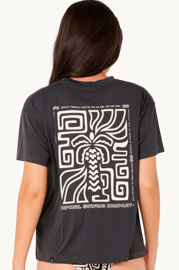 Rip Curl Sunset Luau Surf Lite Suntop in Washed Black features a crew neckline, short sleeves, sun protection rating, and is available in sizes S-L.