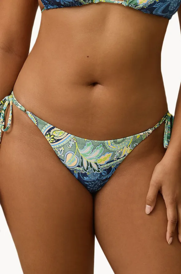 Monte & Lou Taylor Tie Side Pant in Indigo features a low rise design, adjustable tie sides, medium coverage, fully lined, and is available in sizes 8-14.