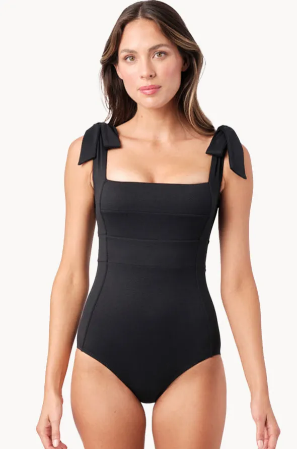 Une Piece Textured Classic Square Neck One Piece in Black offers a square neckline, fixed straps, panelled bodice, fully lined, is best suited to B-D cup sizes.