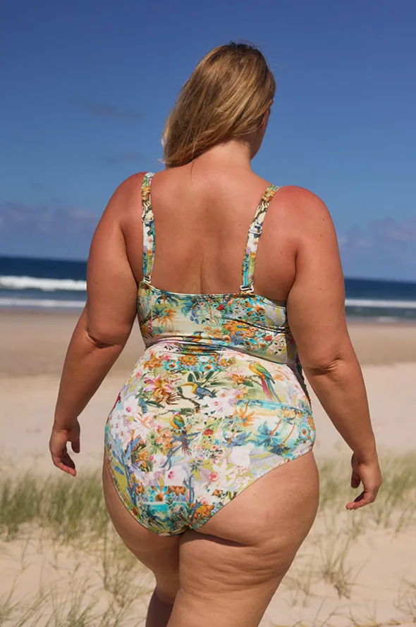 Capriosca Tropicana Frill V Neck One Piece in Multi features a V-shaped neckline with frill, adjustable straps, shelf bra, and is best suited to B-G cup sizes.