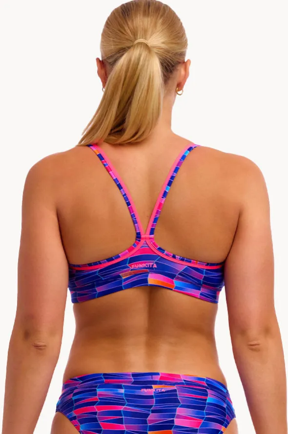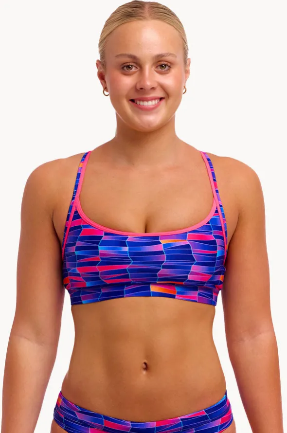 Funkita Warped Waves Sports Top in Navy/Pink features underbust elastic, double bind straps, chlorine resistant, and is best suited to A-C cup sizes.