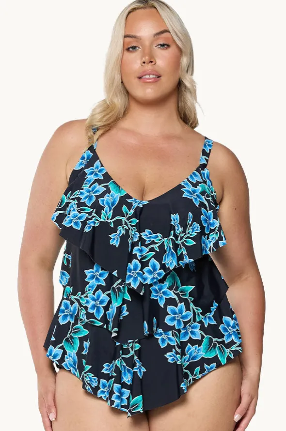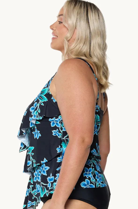 Capriosca Bahamas Blue Tiered Frill Tankini Separate in Black/Blue features tiered frill detail, shelf bra, moulded cups, and is best suited to B-G cup sizes.