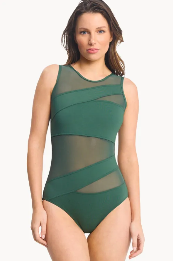 Sunseeker Basix Cross Spliced One Piece in Seaweed features a high neck, mesh panels, back clip, sustainable fabric, and is best suited to A-C cup sizes.