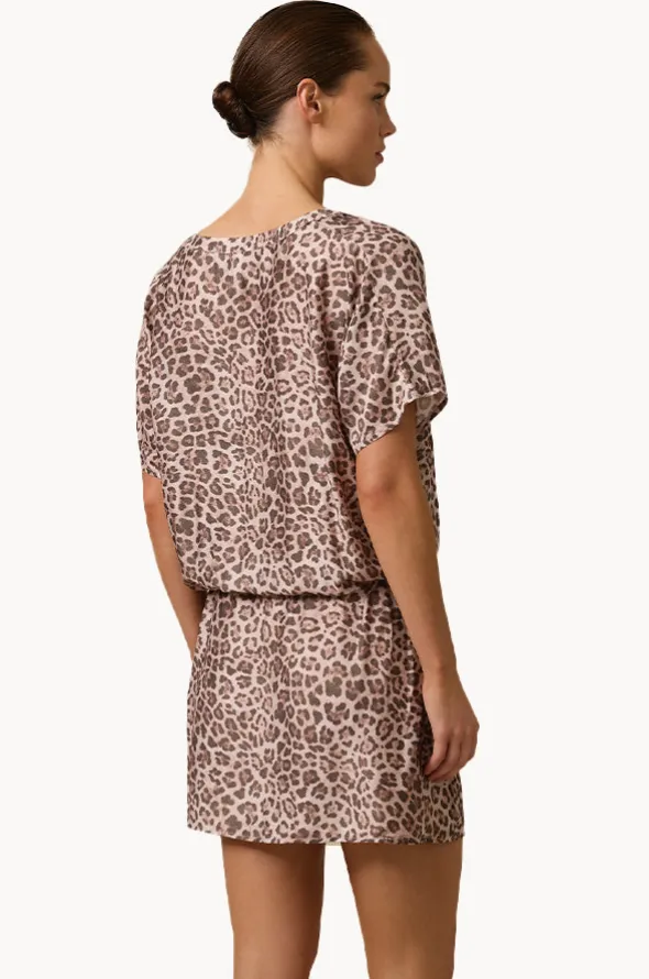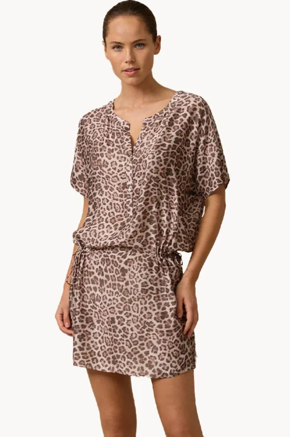 Monte & Lou Belle Short Sleeve Shirt Dress in Animal features a round neckline, button through bodice, short sleeves, loose fit, and is available in sizes XS-L.