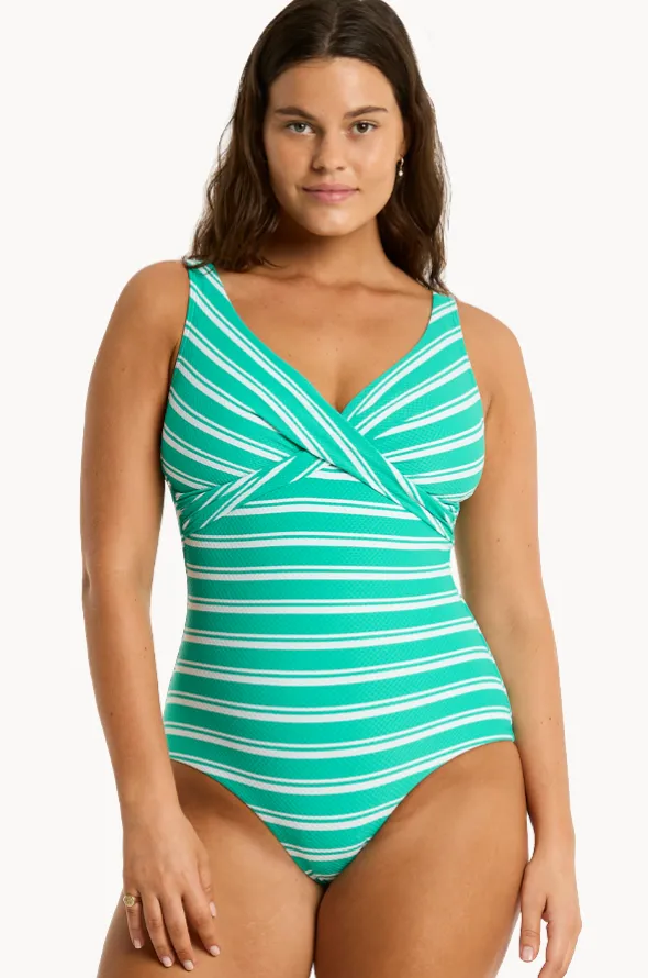 The Sea Level Biarritz Cross Front One Piece in Evergreen features a cross-front design, soft cups, and adjustable straps, designed for sizes 8-16.