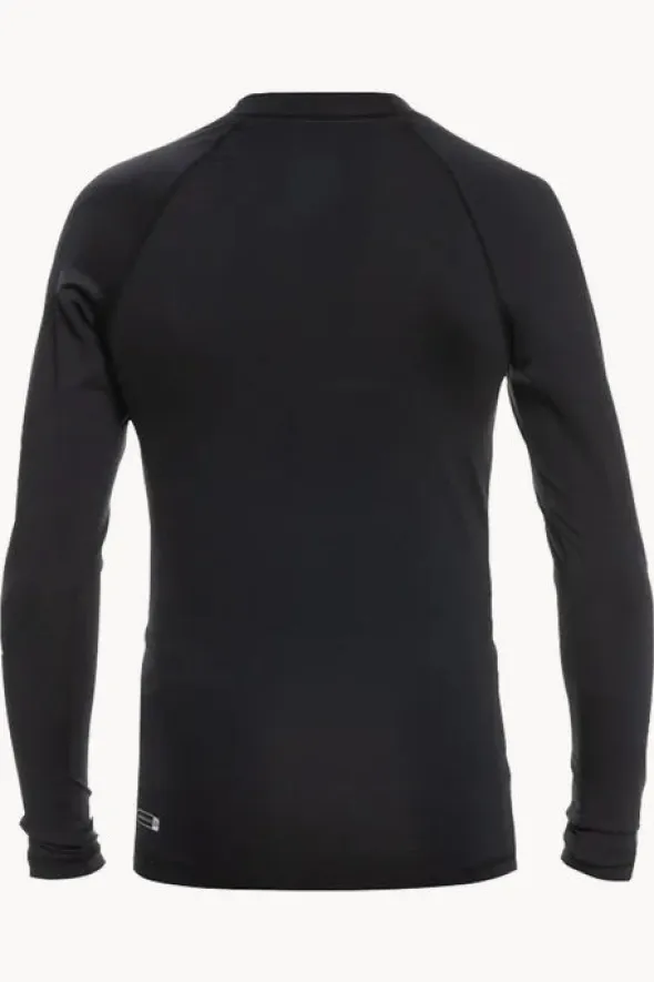 Quiksilver Boys All Time Long Sleeve Suntop in Black features a high neckline, long sleeves, sun protection rating, snug fit, and is available in sizes 10-16.