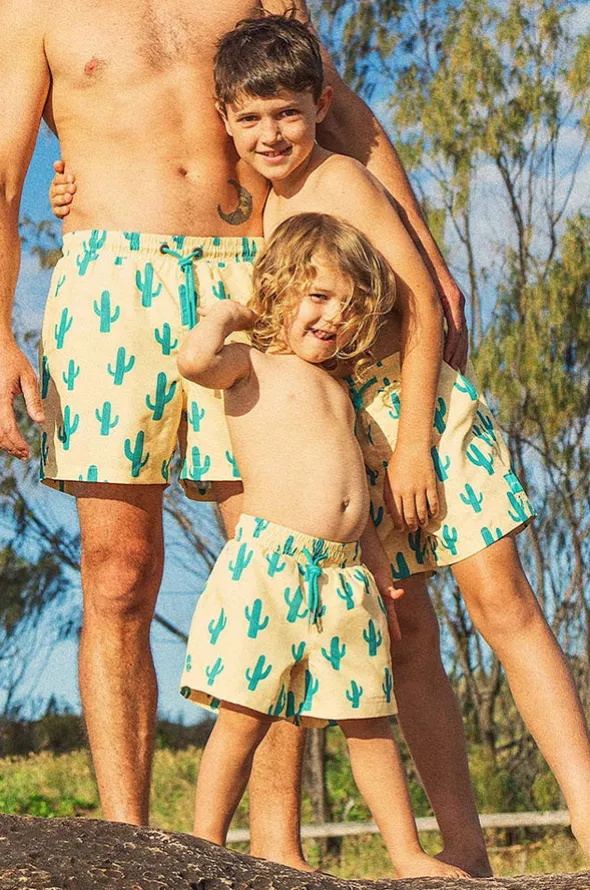 Skwosh Boys Cactus Jack Eco Short in Yellow features an elasticated waistband, drawcord, mesh inner brief, sustainable fabric, and is available in sizes 2-6.