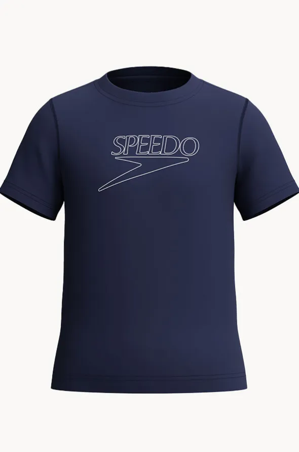 Speedo Boys Classic Logo Short Sleeve Suntop in Peacoat offers a crew neck, short sleeves, sun protection, chlorine resistant, and is available in sizes XS-XL.