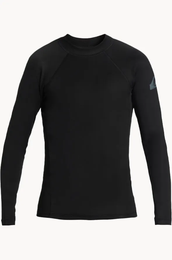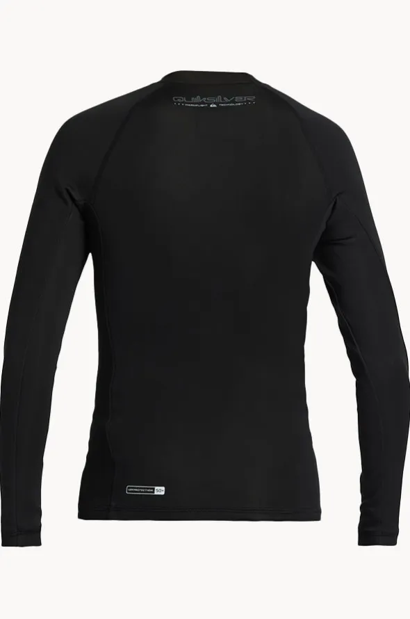Quiksilver Boys Everyday Heat Long Sleeve Suntop in Black features a crew neck, long sleeves, snug fit, sun protection rating, and is available in sizes 3-7.