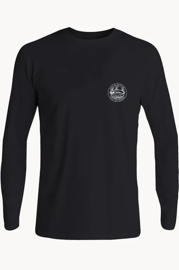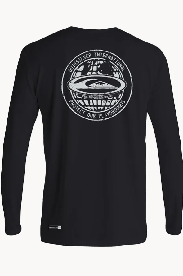 Quiksilver Boys Everyday Surf Long Sleeve Suntop in Black features a crew neck, long sleeves, sun protection rating, loose fit, and is available in sizes 10-16.