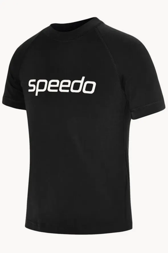 Speedo Boys Logo Suntop in Black features a chlorine resistant fabric, UPF 50+ sun protection rating, short sleeves and Speedo branding detail on centre front.