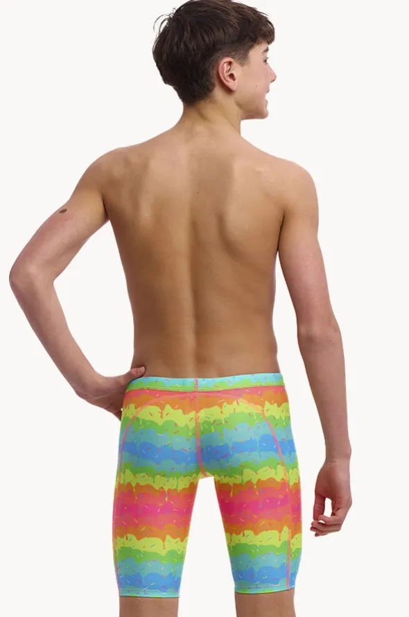 Funky Trunks Boys Melting Mayhem Jammer in Multi features an elasticated waistband, drawcord, flatlock stitching, sustainable and chlorine resistant.
