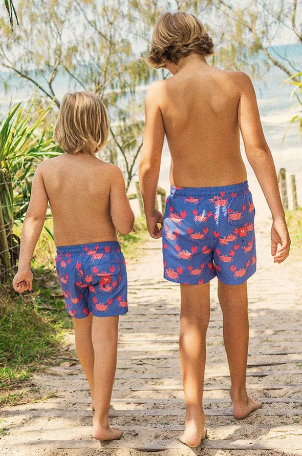 Skwosh Boys Mr Pinchy Eco Short in Navy offers an elasticated waistband, drawcord, mesh inner brief, sustainable fabric, and is available in sizes 2-6.