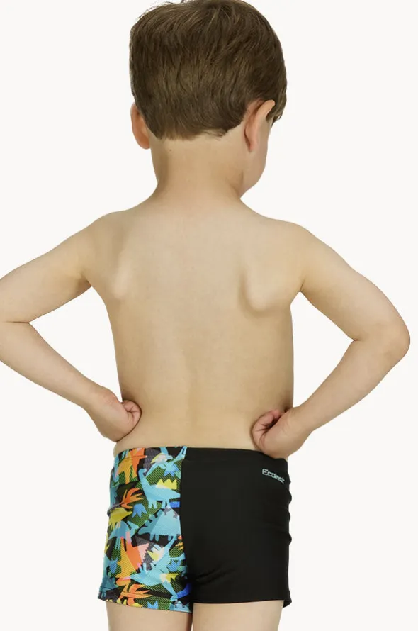Zoggs Boys Saurus Hip Racer Trunk in Ocean features an internal drawcord, 17cm leg length, quick drying, sustainable, and is available in sizes 3-6.
