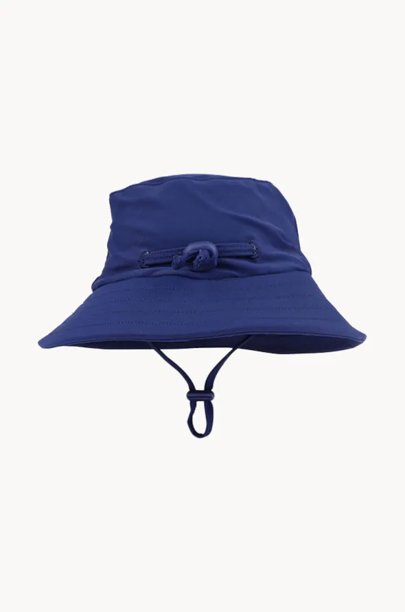 Minihaha Boys Plain Swim Hat in Navy features a bucket hat, wide brim, chin strap, back toggle, sun protection rating, and is available in sizes S-XL.