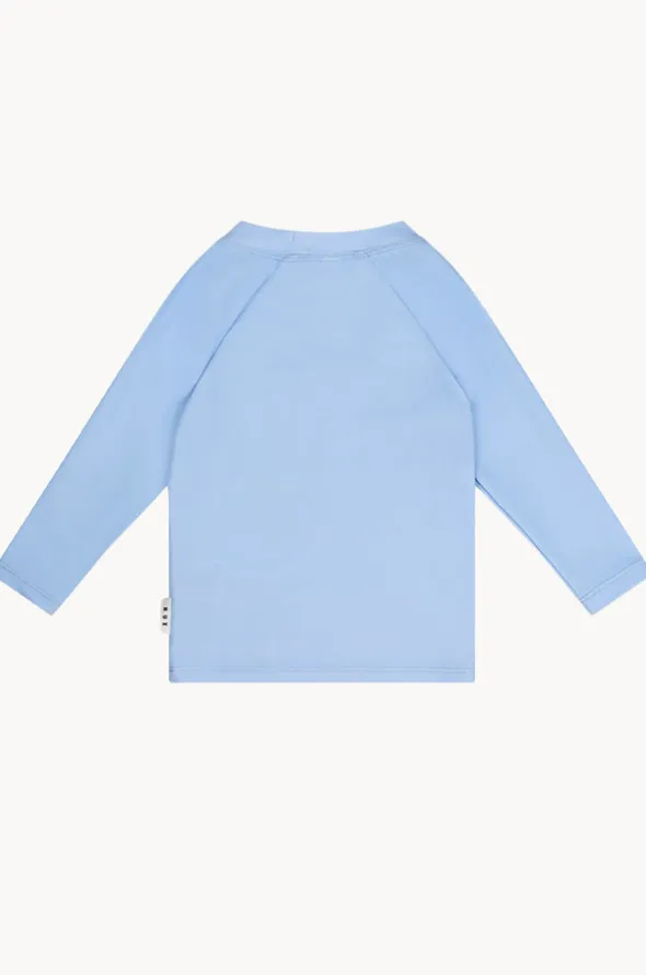 Huxbaby Boys Racer Dino Suntop in Light Blue offers a round neckline, long sleeves, front decal, sun protection rating, sustainable, is available in sizes 2-6.